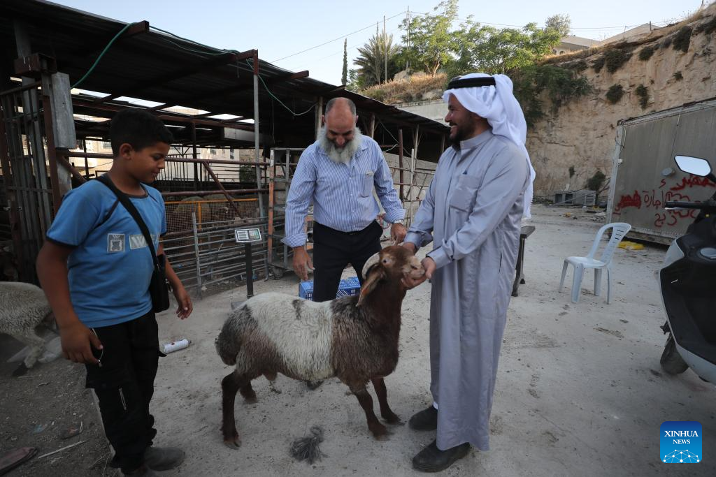 JERUSALEN, 14 junio, 2024 (Xinhua) -- Personas seleccionan ganado en un mercado previo al Eid al-Adha, en Jerusalén, el 14 de junio de 2024. (Xinhua/Jamal Awad)