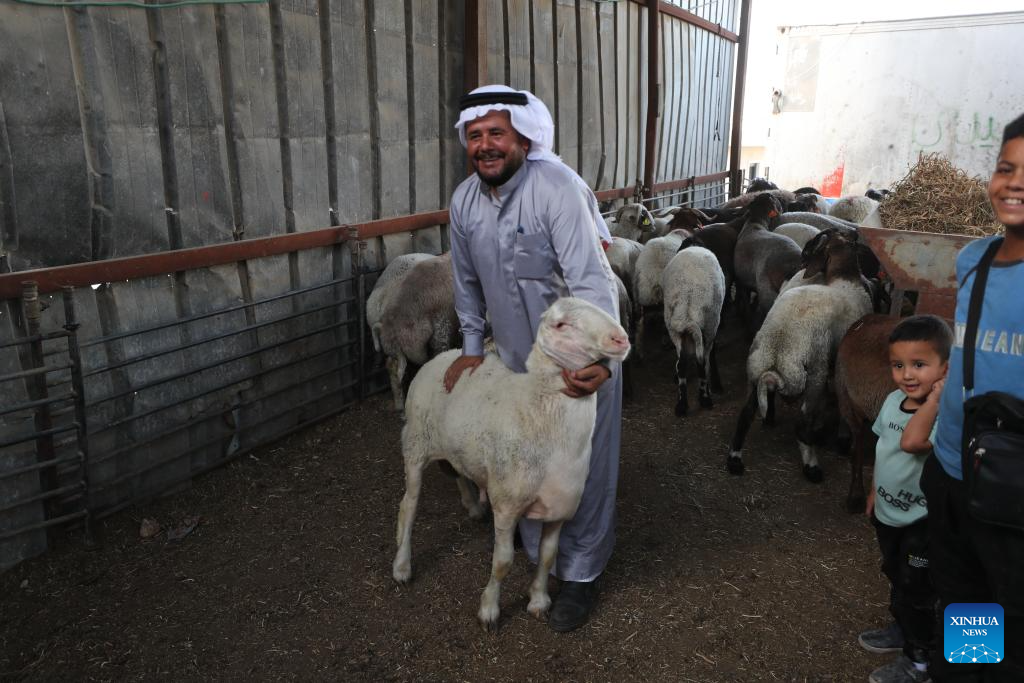 JERUSALEN, 14 junio, 2024 (Xinhua) -- Un hombre selecciona ganado en un mercado previo al Eid al-Adha, en Jerusalén, el 14 de junio de 2024. (Xinhua/Jamal Awad)