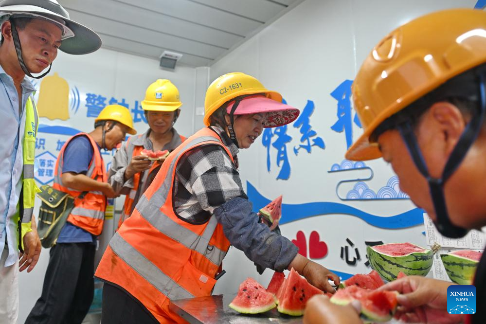 XIONG'AN, 14 junio, 2024 (Xinhua) -- Imagen del 13 de junio de 2024 de trabajadores de la construcción comiendo sandía en una estación de descanso, en la Nueva Area de Xiong'an, en la provincia de Hebei, en el norte de China. Con las olas de calor que han azotado las partes centro y el sur de la provincia de Hebei en los últimos días, las empresas constructoras han tomado medidas de prevención de insolación para los trabajadores al aire libre en la Nueva Area de Xiong'an. (Xinhua/Mu Yu)