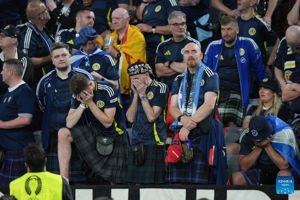 MUNICH, 15 junio, 2024 (Xinhua) -- Imagen del 14 de junio de 2024 de aficionados de Escocia luciendo abatidos durante el partido correspondiente al Grupo A de la Euro 2024 de la UEFA entre Alemania y Escocia, en Múnich, Alemania. (Xinhua/Peng Ziyang)