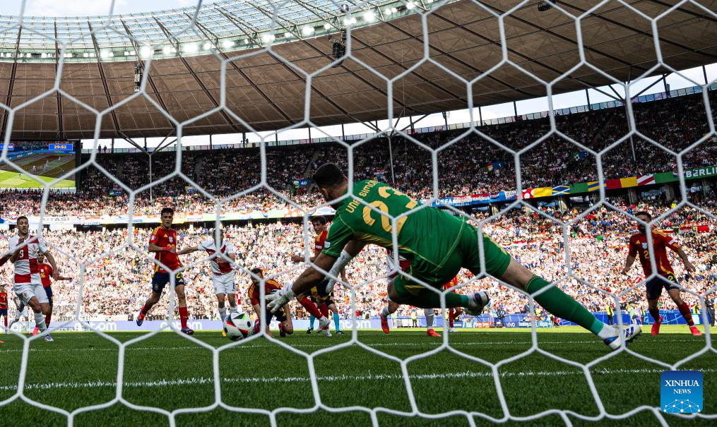 BERLIN, 16 junio, 2024 (Xinhua) -- Imagen del 15 de junio de 2024 del guardameta, Unai Simón (frente), de España, atajando el balón durante el partido del Grupo B de la EURO 2024 de la UEFA entre España y Croacia, en Berlín, Alemania. (Xinhua/Xiao Yijiu)