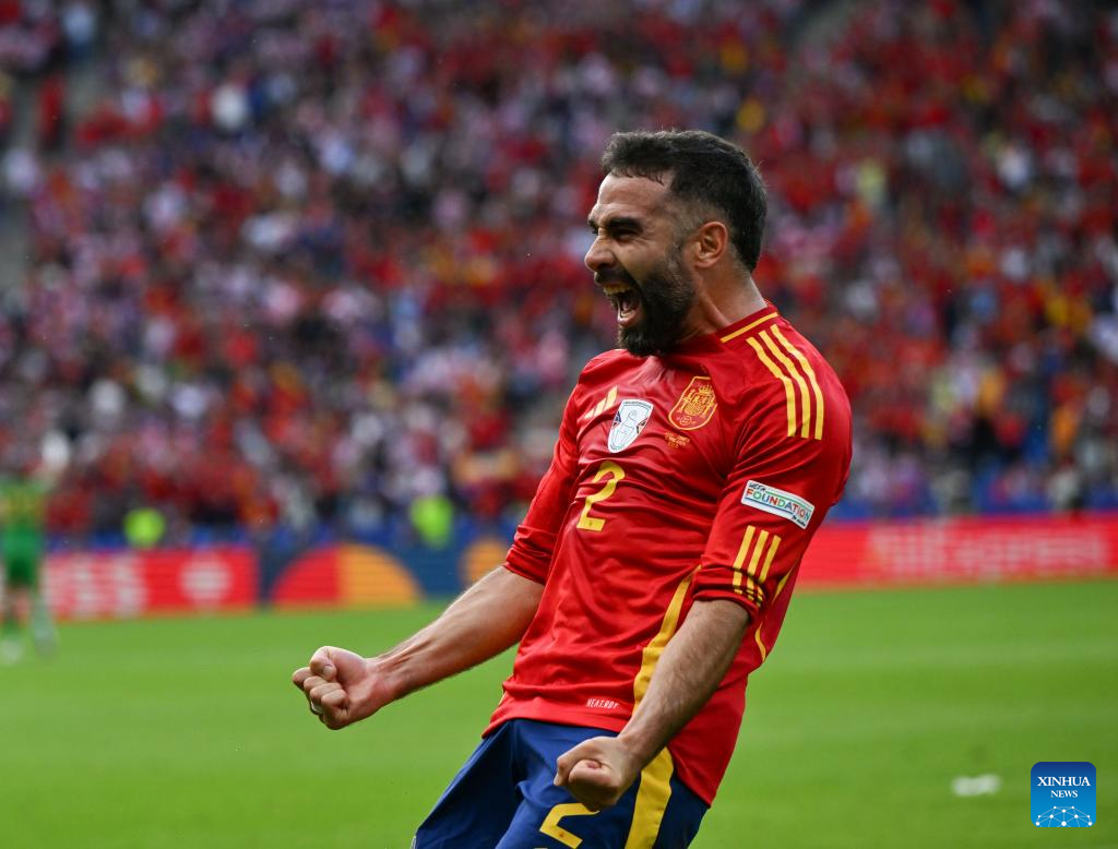 BERLIN, 16 junio, 2024 (Xinhua) -- Imagen del 15 de junio de 2024 de Daniel Carvajal Ramos, de España, festejando su anotación durante el partido del Grupo B de la EURO 2024 de la UEFA entre España y Croacia, en Berlín, Alemania. (Xinhua/Ren Pengfei)
