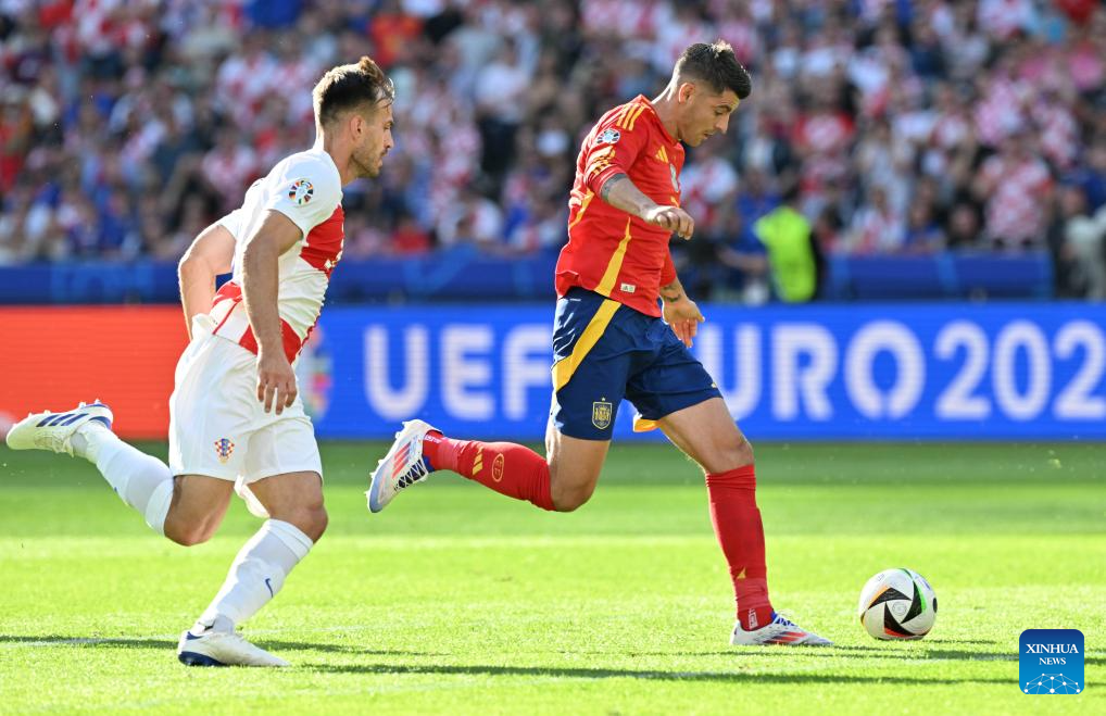 BERLIN, 16 junio, 2024 (Xinhua) -- Imagen del 15 de junio de 2024 de Alvaro Morata (d), de España, abriéndose camino durante el partido del Grupo B de la EURO 2024 de la UEFA entre España y Croacia, en Berlín, Alemania. (Xinhua/Ren Pengfei)