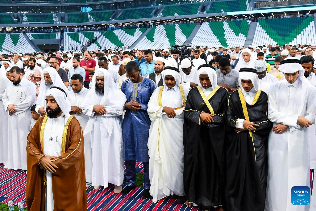 DOHA, 16 junio, 2024 (Xinhua) -- Personas ofrecen oraciones de Eid al-Adha en el Estadio Ciudad de la Educación, en Doha, Qatar, el 16 de junio de 2024. (Xinhua/Nikku)