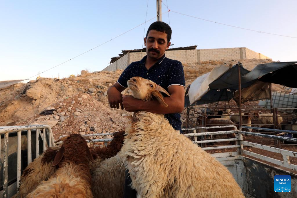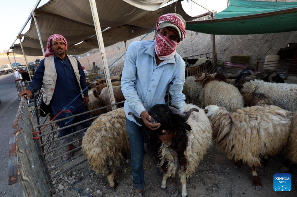 AMAN, 16 junio, 2024 (Xinhua) -- Imagen del 15 de junio de 2024 de un vendedor seleccionando ovejas para sus clientes en un mercado de ganado previo al Eid al-Adha, en Amán, Jordania. (Xinhua/Mohammad Abu Ghosh)