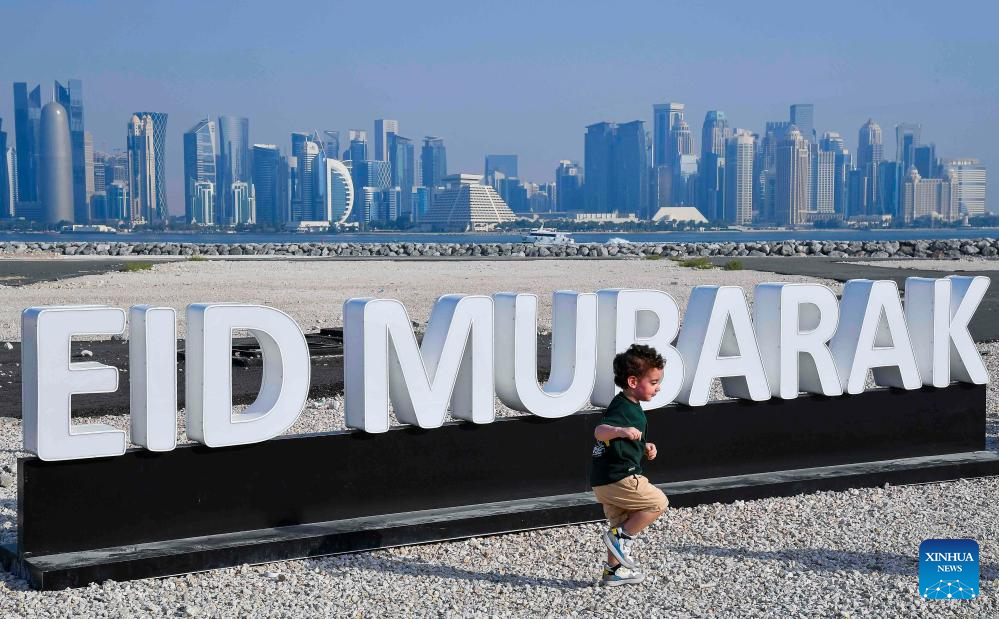 DOHA, 16 junio, 2024 (Xinhua) -- Un niño es visto frente a una instalación que marca las celebraciones del Eid al-Adha en el Viejo Puerto de Doha, en Doha, Qatar, el 16 de junio de 2024. (Xinhua/Nikku)