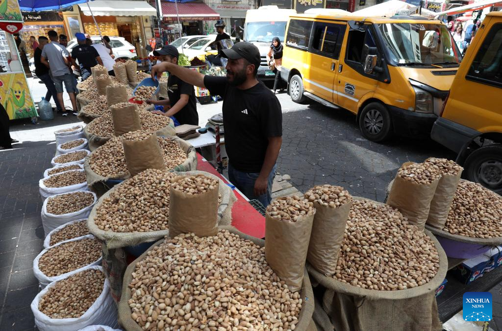 RAMALLAH, 16 junio, 2024 (Xinhua) -- Imagen del 15 de junio de 2024 de un vendedor intentando llamar la atención de las personas hacia su mercancía en un mercado previo al Eid al-Adha, en la ciudad cisjordana de Ramallah. (Xinhua/Ayman Nobani)