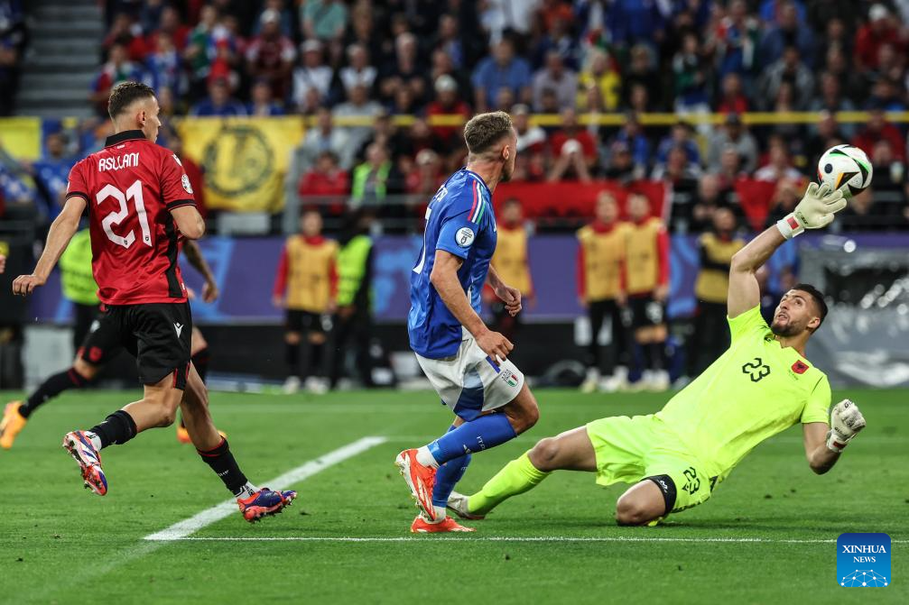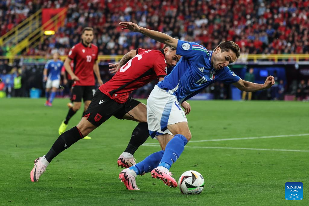 DORTMUND, 16 junio, 2024 (Xinhua) -- Imagen del 15 de junio de 2024 de Davide Frattesi (c), de Italia, disparando el balón durante el partido del Grupo B de la EURO 2024 de la UEFA entre Italia y Albania, en Dortmund, Alemania. (Xinhua/Pan Yulong)