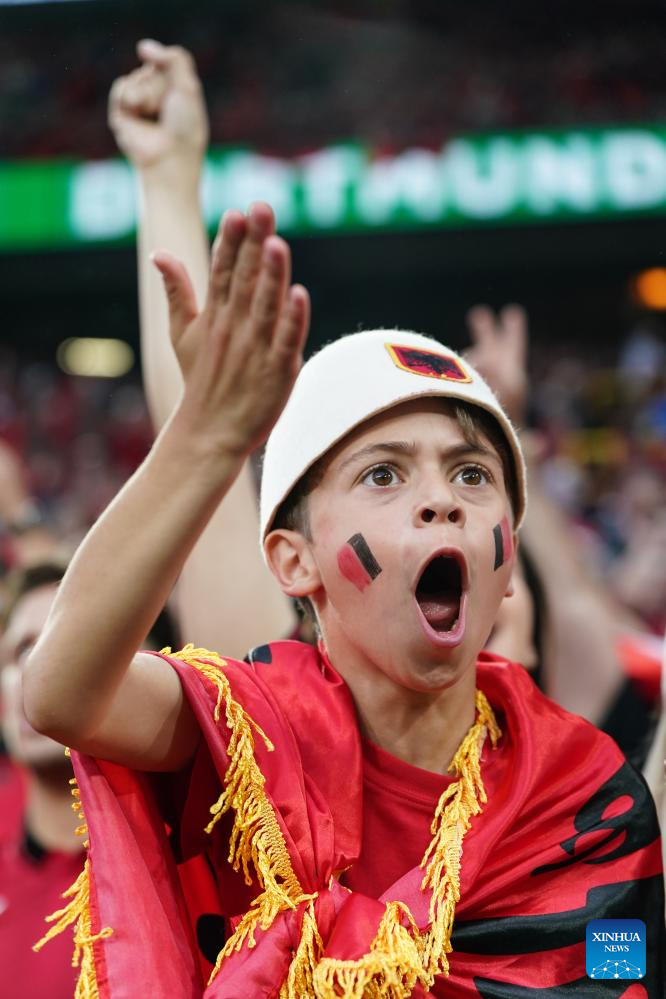 DORTMUND, 16 junio, 2024 (Xinhua) -- Imagen del 15 de junio de 2024 de un aficionado de Albania animando a su equipo previo al partido del Grupo B de la EURO 2024 de la UEFA entre Italia y Albania, en Dortmund, Alemania. (Xinhua/Peng Ziyang)