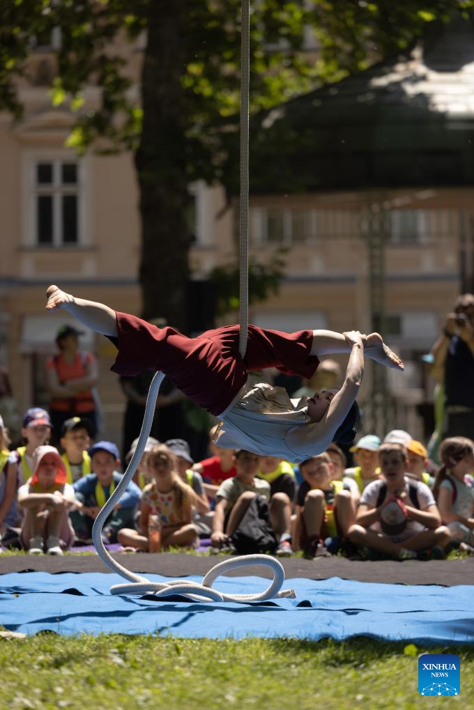 LIUBLIANA, 17 junio, 2024 (Xinhua) -- Un acróbata realiza una presentación durante el Festival Internacional de Clown Contemporáneo y Nuevo Circo, en Liubliana, Eslovenia, el 17 de junio de 2024. El Festival Internacional de Clown Contemporáneo y Nuevo Circo se lleva a cabo aquí del 17 al 23 de junio. (Xinhua/Zeljko Stevanic)