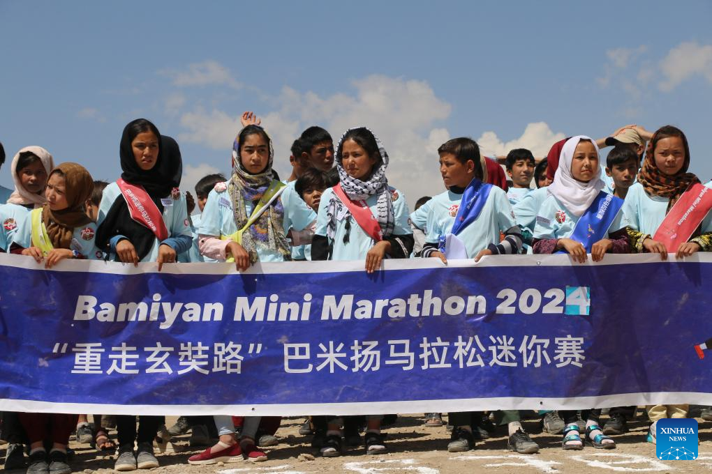 BAMIYAN, 17 junio, 2024 (Xinhua) -- Imagen del 15 de junio de 2024 de la ceremonia de premiación de un mini-maratón destinado a concienciar a la población local sobre la urgente necesidad de proteger las reliquias culturales, en la provincia de Bamiyán, en el centro de Afganistán. Algunos vestidos con sandalias simples, los niños afganos del valle de Bamiyán salieron a correr frente al sitio de los Budas gigantes, declarado Patrimonio de la Humanidad por la UNESCO, un símbolo icónico de la rica historia cultural de Afganistán. (Xinhua/Ziaodin Aza)