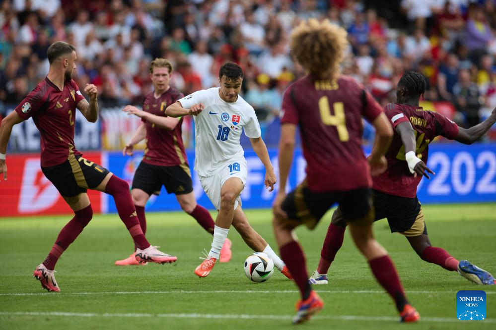 FRANKFURT, 18 junio, 2024 (Xinhua) -- Imagen del 17 de junio de 2024 de David Strelec (c), de Eslovaquia, abriéndose camino durante el partido correspondiente al Grupo E de la EURO 2024 de la UEFA entre Bélgica y Eslovaquia, en Frankfurt, Alemania. (Xinhua/Meng Dingbo)
