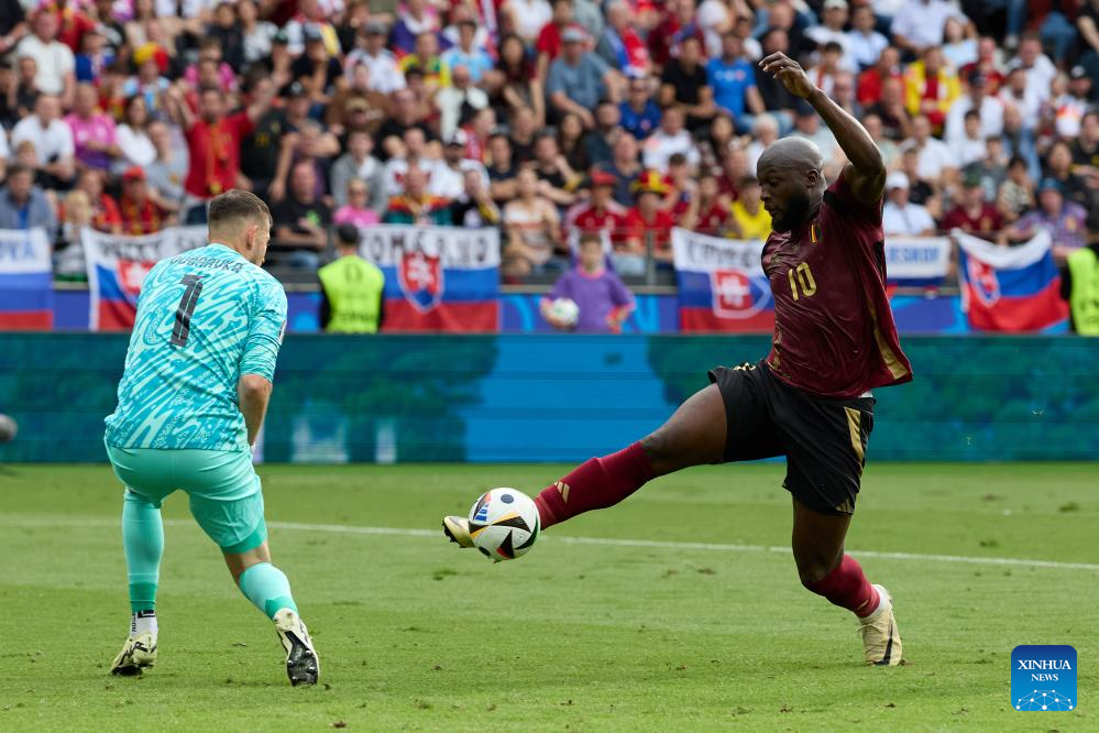 FRANKFURT, 18 junio, 2024 (Xinhua) -- Imagen del 17 de junio de 2024 de Romelu Lukaku (d), de Bélgica, disparando durante partido correspondiente al Grupo E de la EURO 2024 de la UEFA entre Bélgica y Eslovaquia, en Frankfurt, Alemania. (Xinhua/Meng Dingbo)