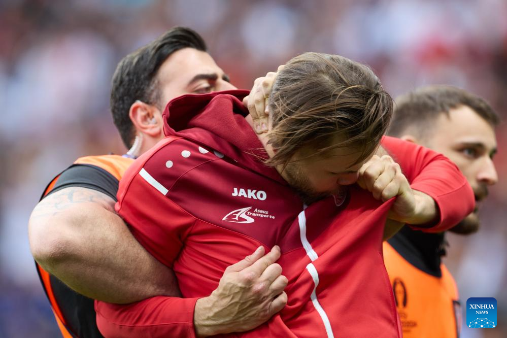 FRANKFURT, 18 junio, 2024 (Xinhua) -- Imagen del 17 de junio de 2024 de jugadores de Eslovaquia festejando al término del partido correspondiente al Grupo E de la EURO 2024 de la UEFA entre Bélgica y Eslovaquia, en Frankfurt, Alemania. (Xinhua/Meng Dingbo)
