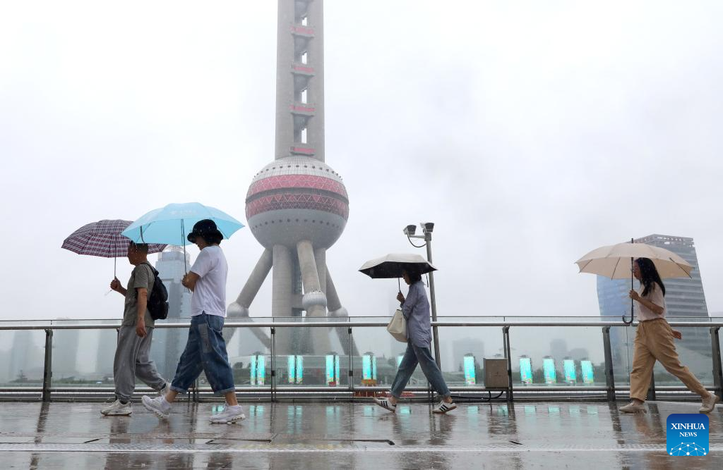 SHANGHAI, 19 junio, 2024 (Xinhua) -- Personas sostienen sombrillas mientras caminan bajo la lluvia, en Lujiazui, una zona financiera, en Shanghai, en el este de China, el 19 de junio de 2024. Las autoridades meteorológicas de Shanghai emitieron una alerta amarilla por relámpagos y una alerta azul por tormentas de lluvia el martes. (Xinhua/Fang Zhe)