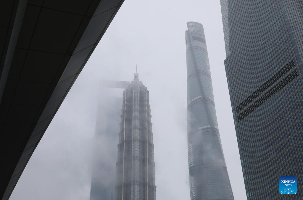 SHANGHAI, 19 junio, 2024 (Xinhua) -- Rascacielos son rodeados por nubes, en Lujiazui, una zona financiera, en Shanghai, en el este de China, el 19 de junio de 2024. Las autoridades meteorológicas de Shanghai emitieron una alerta amarilla por relámpagos y una alerta azul por tormentas de lluvia el martes. (Xinhua/Fang Zhe)