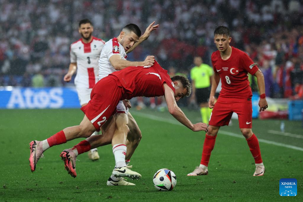 DORTMUND, 19 junio, 2024 (Xinhua) -- Imagen del 18 de junio de 2024 de Baris Alper Yilmaz (2-d), de Turquía, disputando el balón con Luka Lochoshvili (2-i), de Georgia, durante el partido correspondiente al Grupo F de la EURO 2024 de la UEFA entre Turquía y Georgia, en Dortmund, Alemania. (Xinhua/Pan Yulong)