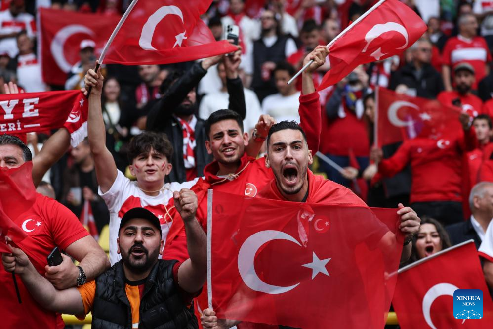 DORTMUND, 19 junio, 2024 (Xinhua) -- Imagen del 18 de junio de 2024 de aficionados de Turquía, animando en las gradas durante el partido correspondiente al Grupo F de la EURO 2024 de la UEFA entre Turquía y Georgia, en Dortmund, Alemania. (Xinhua/Pan Yulong)