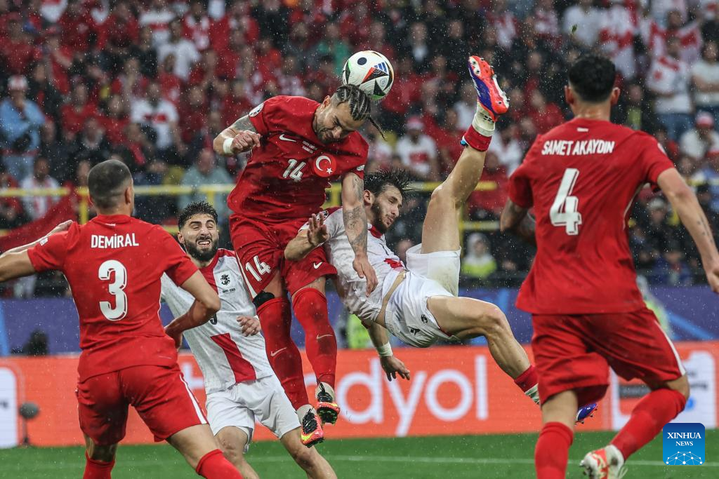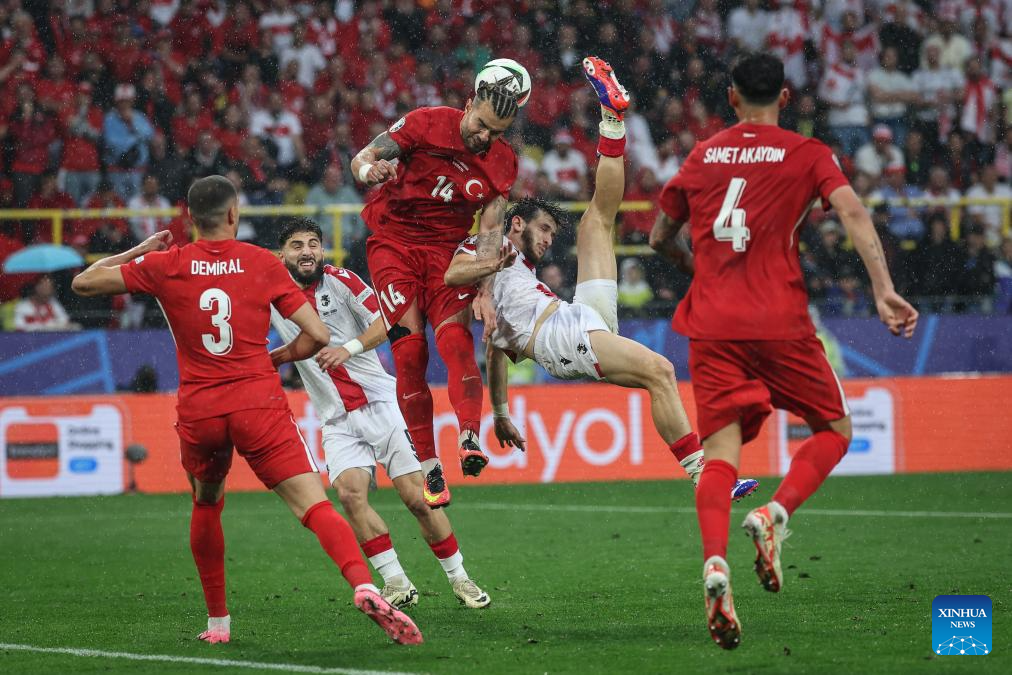 DORTMUND, 19 junio, 2024 (Xinhua) -- Imagen del 18 de junio de 2024 de Merih Demiral (2-d), de Turquía, disputando el balón con Budu Zivzivadze (d), de Georgia, durante el partido correspondiente al Grupo F de la EURO 2024 de la UEFA entre Turquía y Georgia, en Dortmund, Alemania. (Xinhua/Pan Yulong)