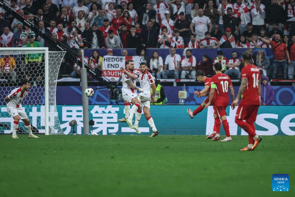 DORTMUND, 19 junio, 2024 (Xinhua) -- Imagen del 18 de junio de 2024 de Mert Gunok (arriba), de Turquía, atajando el balón, durante el partido correspondiente al Grupo F de la EURO 2024 de la UEFA entre Turquía y Georgia, en Dortmund, Alemania. (Xinhua/Pan Yulong)