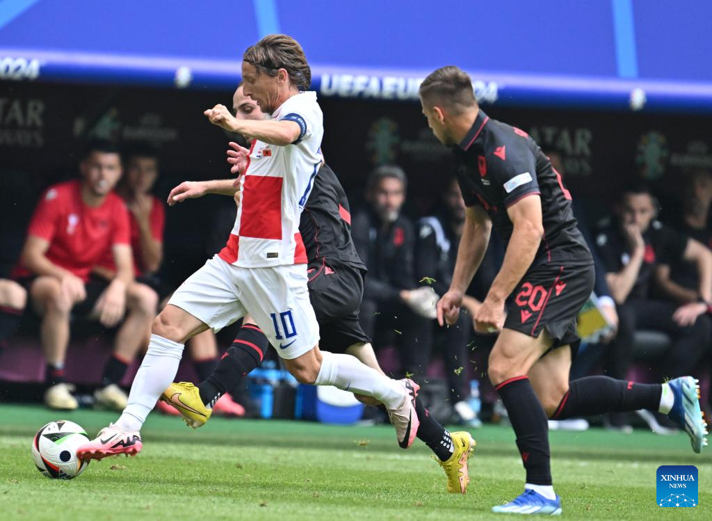 HAMBURGO, 19 junio, 2024 (Xinhua) -- Luka Modric (i), de Croacia, disputa el balón con Rei Manaj, de Albania, durante el partido correspondiente al Grupo B de la EURO 2024 de la UEFA entre Croacia y Albania, en Hamburgo, Alemania, el 19 de junio de 2024. (Xinhua/Xiao Yijiu)