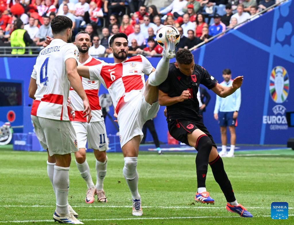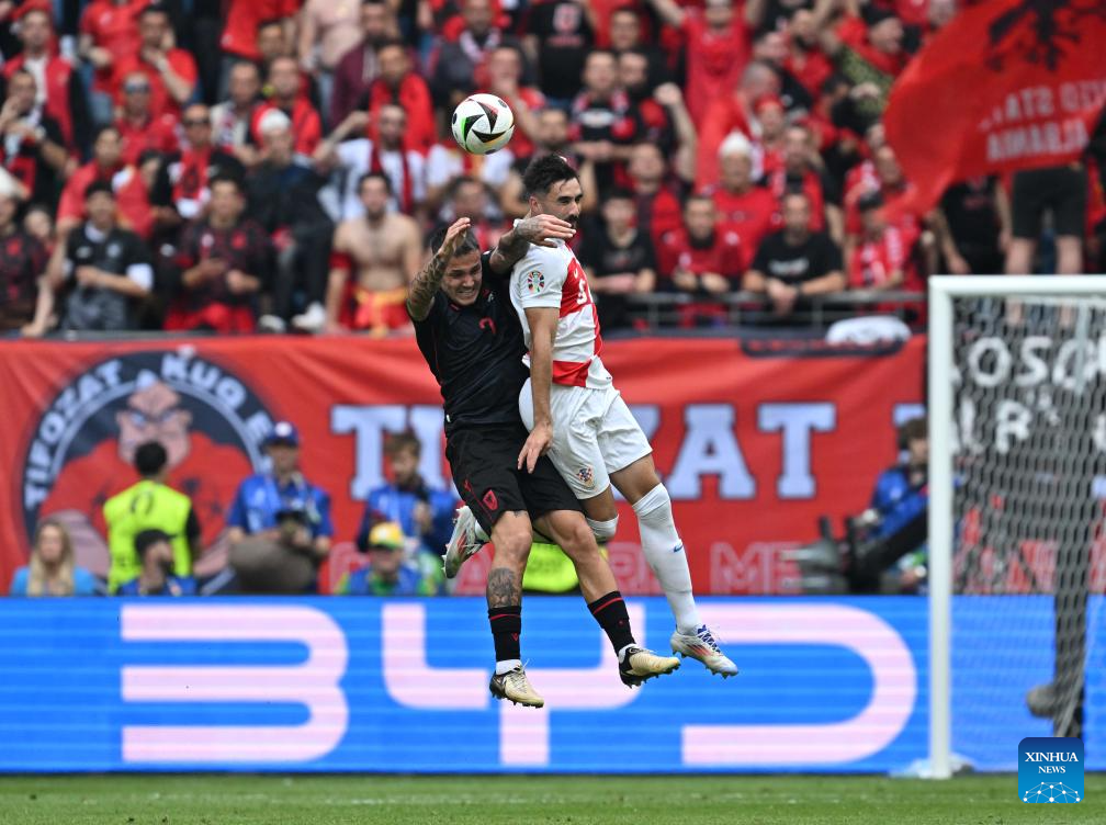 HAMBURGO, 19 junio, 2024 (Xinhua) -- Andrej Kramaric (d), de Croacia, disputa el balón con Jasir Asani, de Albania, durante el partido correspondiente al Grupo B de la EURO 2024 de la UEFA entre Croacia y Albania, en Hamburgo, Alemania, el 19 de junio de 2024. (Xinhua/Ren Pengfei)