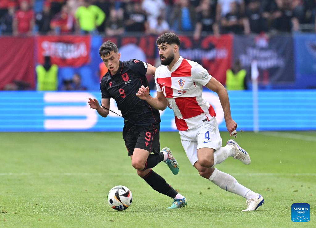 HAMBURGO, 19 junio, 2024 (Xinhua) -- Josip Sutalo (d), de Croacia, disputa el balón con Rei Manaj, de Albania, durante el partido correspondiente al Grupo B de la EURO 2024 de la UEFA entre Croacia y Albania, en Hamburgo, Alemania, el 19 de junio de 2024. (Xinhua/Ren Pengfei)