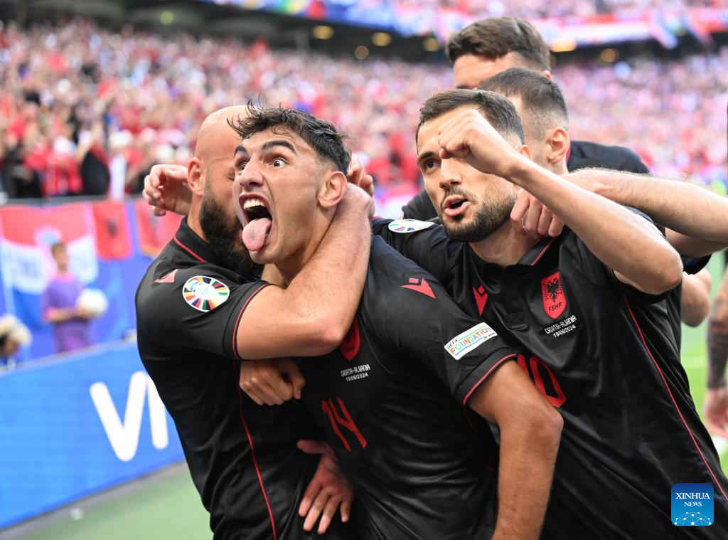 HAMBURGO, 19 junio, 2024 (Xinhua) -- Qazim Laci, de Albania, festeja su anotación durante el partido correspondiente al Grupo B de la EURO 2024 de la UEFA entre Croacia y Albania, en Hamburgo, Alemania, el 19 de junio de 2024. (Xinhua/Xiao Yijiu)