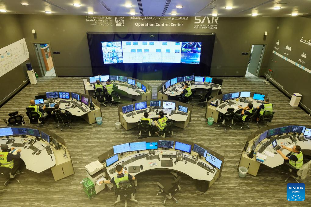 LA MECA, 20 junio, 2024 (Xinhua) -- Imagen del 19 de junio de 2024 de empleados supervisando el funcionamiento de la Línea del Metro de Al Mashaaer Al Mugaddassah, en La Meca, Arabia Saudita. La Corporación de Construcción de Ferrocarriles de China (CRCC, por sus siglas en inglés) anunció el miércoles que ha completado la operación de la Hajj 2024 de la Línea de Metro de Al Mashaaer Al Mugaddassah en la ciudad de La Meca en Arabia Saudita. A lo largo de siete días, 2.206 trenes han sido despachados, prestado servicio a unos 2.094 millones de pasajeros, dijo la CRCC en un comunicado. (Xinhua/CRCC)