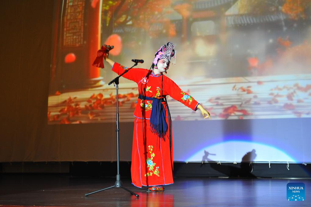 TUNEZ, 20 junio, 2024 (Xinhua) -- Imagen del 19 de junio de 2024 de una concursante participando en el primer concurso de la canción china de Túnez, en Túnez, Túnez. Diecisiete amantes del idioma chino y la música china procedentes de Túnez participaron el miércoles en la final del primer concurso de la canción china del país. Los participantes interpretaron canciones pop chinas y óperas de Pekín durante el evento de dos horas de duración auspiciado por la Embajada de China en Túnez y organizado por el Instituto Confucio de la Universidad de Cartago en la ciudad capital de Túnez. (Xinhua/Adel Ezzine)