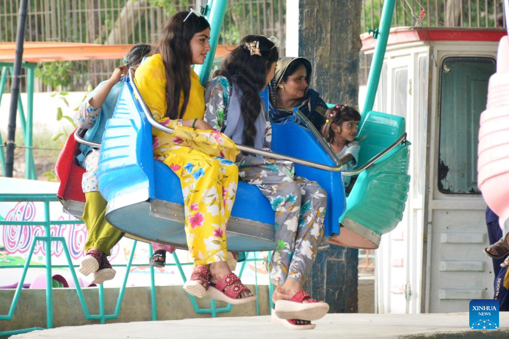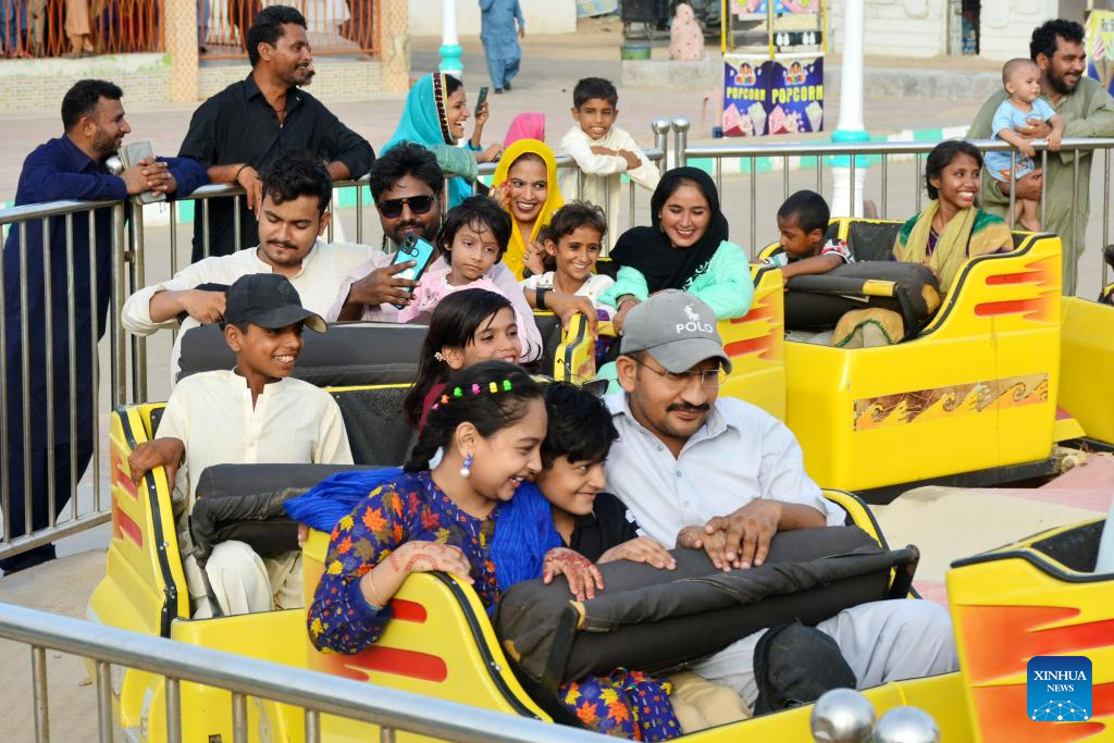 HYDERABAD, 19 junio, 2024 (Xinhua) -- Personas se divierten en un parque de atracciones durante las vacaciones del Eid al-Adha, en Hyderabad, Pakistán, el 19 de junio de 2024. (Xinhua/Str)