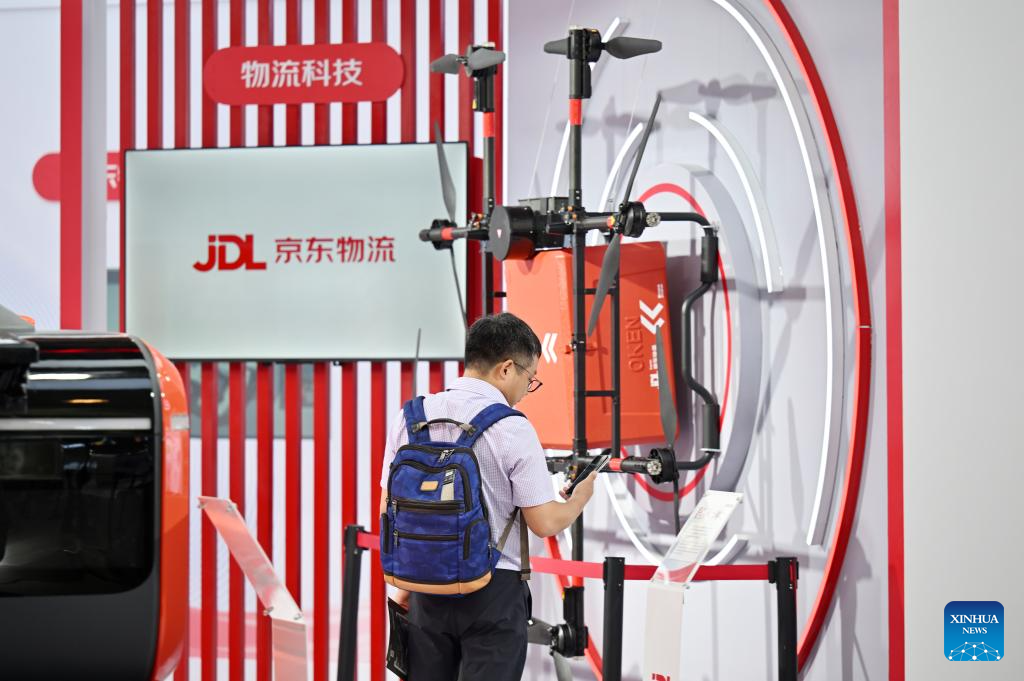 TIANJIN, 21 junio, 2024 (Xinhua) -- Visitantes observan drones en el área de exposición sobre economía de baja altitud en la Exposición Mundial de Inteligencia 2024, en Tianjin, en el norte de China, el 21 de junio de 2024. La Exposición Mundial de Inteligencia 2024, bajo el tema "Inteligencia: Amplio Espacio de Desarrollo y Motor de Crecimiento Sostenible", se inauguró el jueves en Tianjin, en el norte de China, y la exposición sobre economía de baja altitud ha acaparado mucha atención. La creciente economía de baja altitud ha llevado al desarrollo y la aplicación de diversos tipos de vehículos aéreos innovadores para la logística, los desplazamientos, el turismo e incluso los deportes. Abarca una cadena de industrias, que incluyen la investigación y el desarrollo de aeronaves, la construcción y operación de infraestructura y los servicios para actividades de vuelo. (Xinhua/Sun Fanyue)