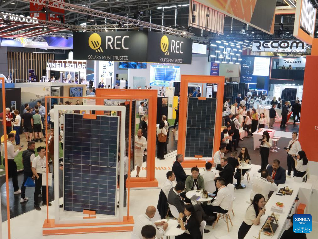 MUNICH, 21 junio, 2024 (Xinhua) -- Imagen del 20 de junio de 2024 de una escena en la exposición Intersolar Europa 2024, en Munich, Alemania. La exposición Intersolar Europa 2024 se celebró en Munich del 19 al 21 de junio. (Xinhua/Li Hanlin)