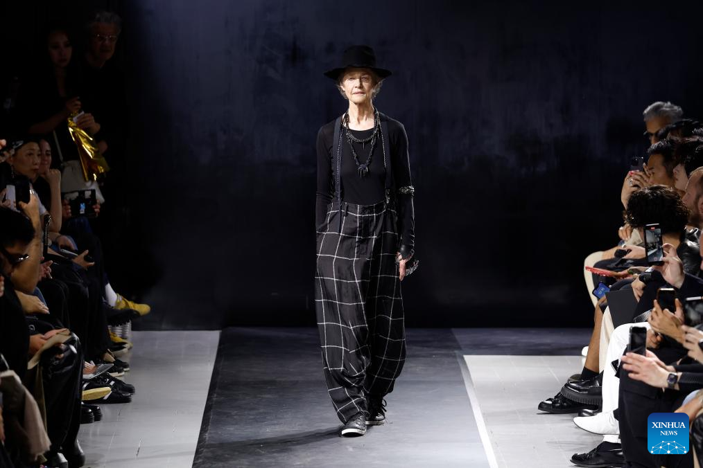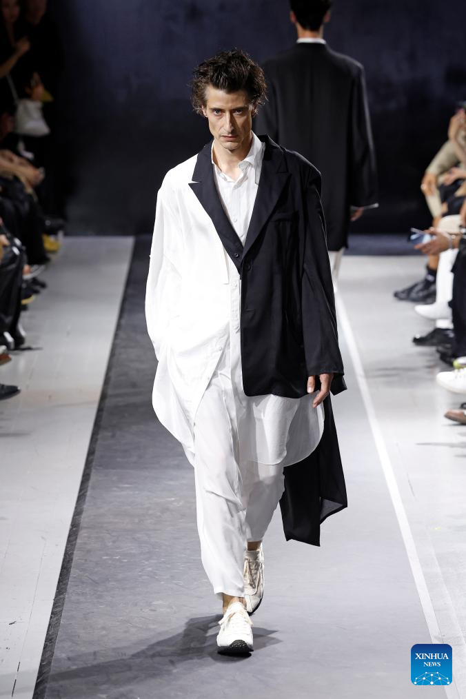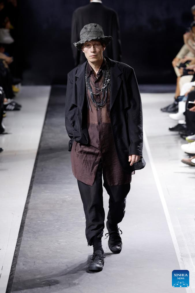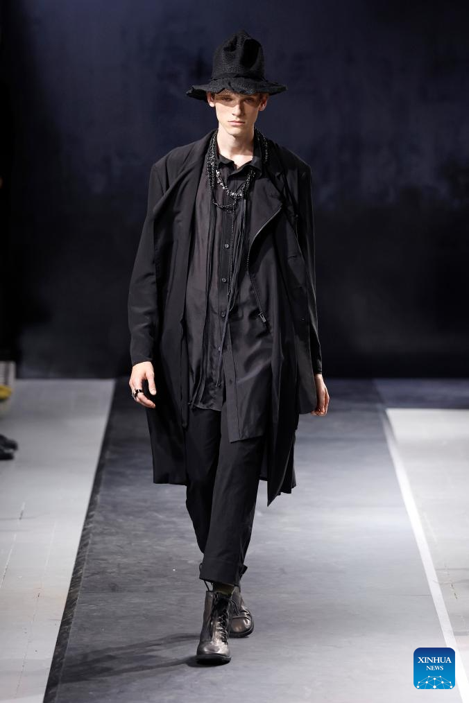 PARIS, 21 junio, 2024 (Xinhua) -- Imagen del 20 de junio de 2024 de un modelo presentando una creación de las colecciones de Ropa para Hombre Primavera/Verano 2025 de Yohji Yamamoto durante la Semana de la Moda de París, en París, Francia. (Xinhua/MeetEurope)