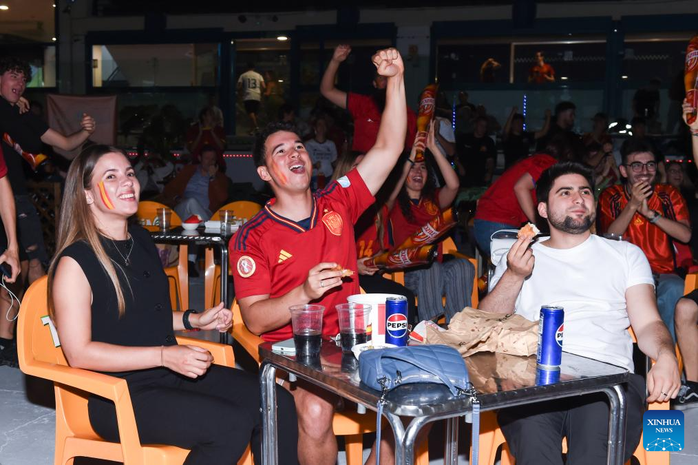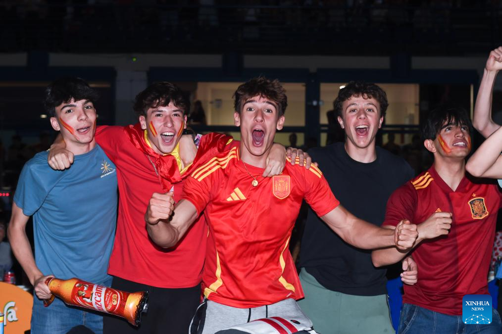 MADRID, 21 junio, 2024 (Xinhua) -- Imagen del 20 de junio de 2024 de aficionados al fútbol reaccionando mientras observan el partido correspondiente al Grupo B de la EURO 2024 de la UEFA, entre España e Italia, en una pantalla en una pista de hielo, en Madrid, España. (Xinhua/Gustavo Valiente)