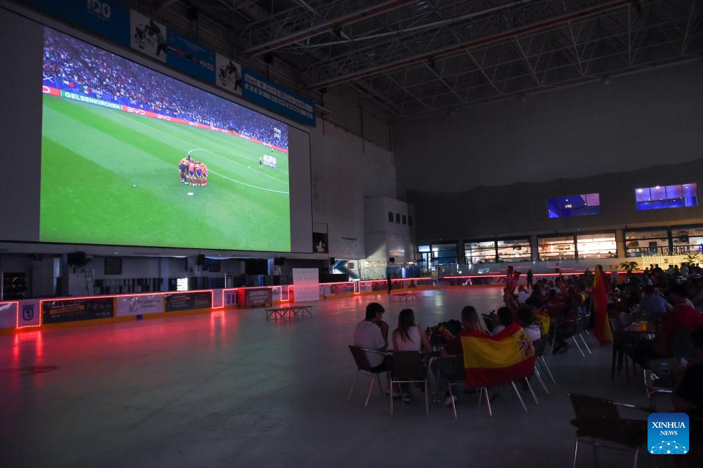 MADRID, 21 junio, 2024 (Xinhua) -- Imagen del 20 de junio de 2024 de aficionados al fútbol observando el partido correspondiente al Grupo B de la EURO 2024 de la UEFA, entre España e Italia, en una pantalla en una pista de hielo, en Madrid, España. (Xinhua/Gustavo Valiente)