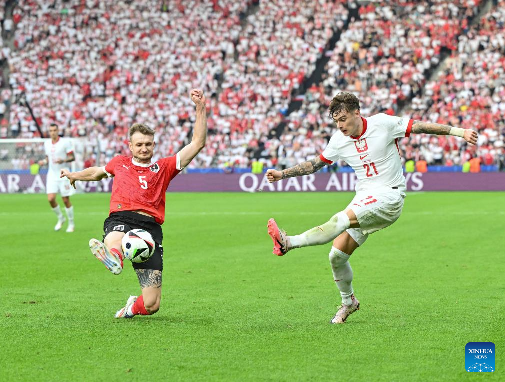 BERLÍN, 22 junio, 2024 (Xinhua) -- Imagen del 21 de junio de 2024 de Nicola Zalewski (d), de Polonia, pasando el balón durante el partido correspondiente al Grupo D de la EURO 2024 de la UEFA, entre Polonia y Austria, en Berlín, Alemania. (Xinhua/Ren Pengfei)