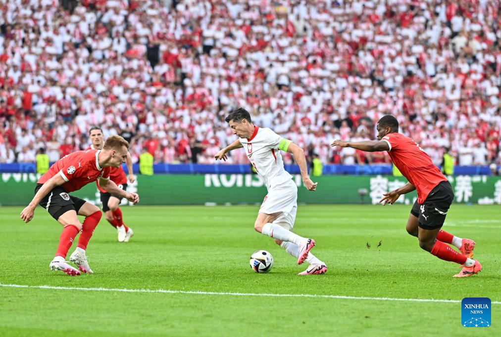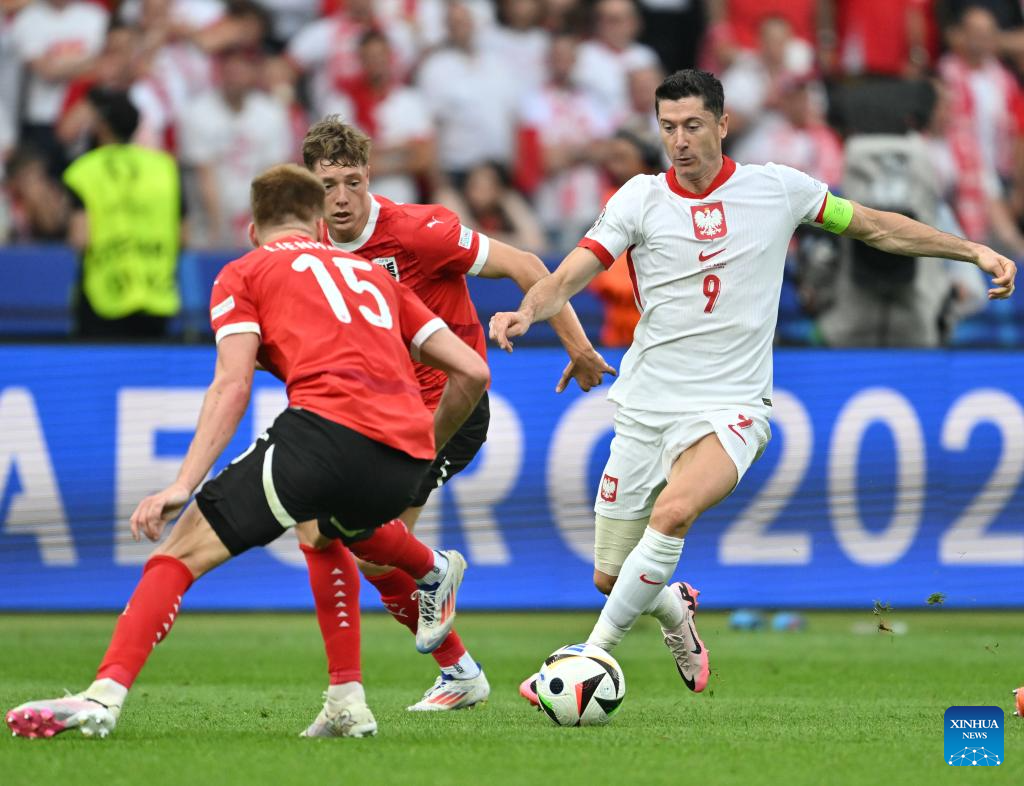 BERLIN, 22 junio, 2024 (Xinhua) -- Imagen del 21 de junio de 2024 de Robert Lewandowski (c), de Polonia, abriéndose paso durante el partido correspondiente al Grupo D de la EURO 2024 de la UEFA, entre Polonia y Austria, en Berlín, Alemania. (Xinhua/Ren Pengfei)