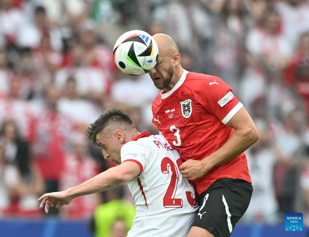 BERLIN, 22 junio, 2024 (Xinhua) -- Imagen del 21 de junio de 2024 de Gernot Trauner (d), de Austria, disputando el balón con Krzysztof Piatek, de Polonia, durante el partido correspondiente al Grupo D de la EURO 2024 de la UEFA, entre Polonia y Austria, en Berlín, Alemania. (Xinhua/Ren Pengfei)