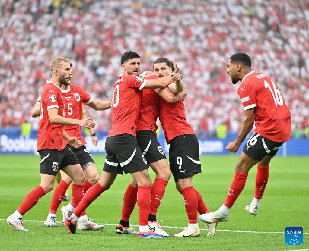 BERLÍN, 22 junio, 2024 (Xinhua) -- Imagen del 21 de junio de 2024 de jugadores de Austria festejando una anotación durante el partido correspondiente al Grupo D de la EURO 2024 de la UEFA, entre Polonia y Austria, en Berlín, Alemania. (Xinhua/Ren Pengfei)