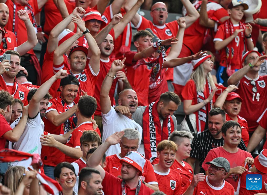 BERLÍN, 22 junio, 2024 (Xinhua) -- Imagen del 21 de junio de 2024 de aficionados de la selección de Austria festejando una anotación durante el partido correspondiente al Grupo D de la EURO 2024 de la UEFA, entre Polonia y Austria, en Berlín, Alemania. (Xinhua/Ren Pengfei)