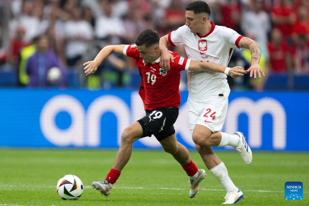 BERLIN, 22 junio, 2024 (Xinhua) -- Imagen del 21 de junio de 2024 de Christoph Baumgartner (i), de Austria, disputando el balón con Bartosz Slisz, de Polonia, durante el partido correspondiente al Grupo D de la EURO 2024 de la UEFA, entre Polonia y Austria, en Berlín, Alemania. (Xinhua/Xiao Yijiu)