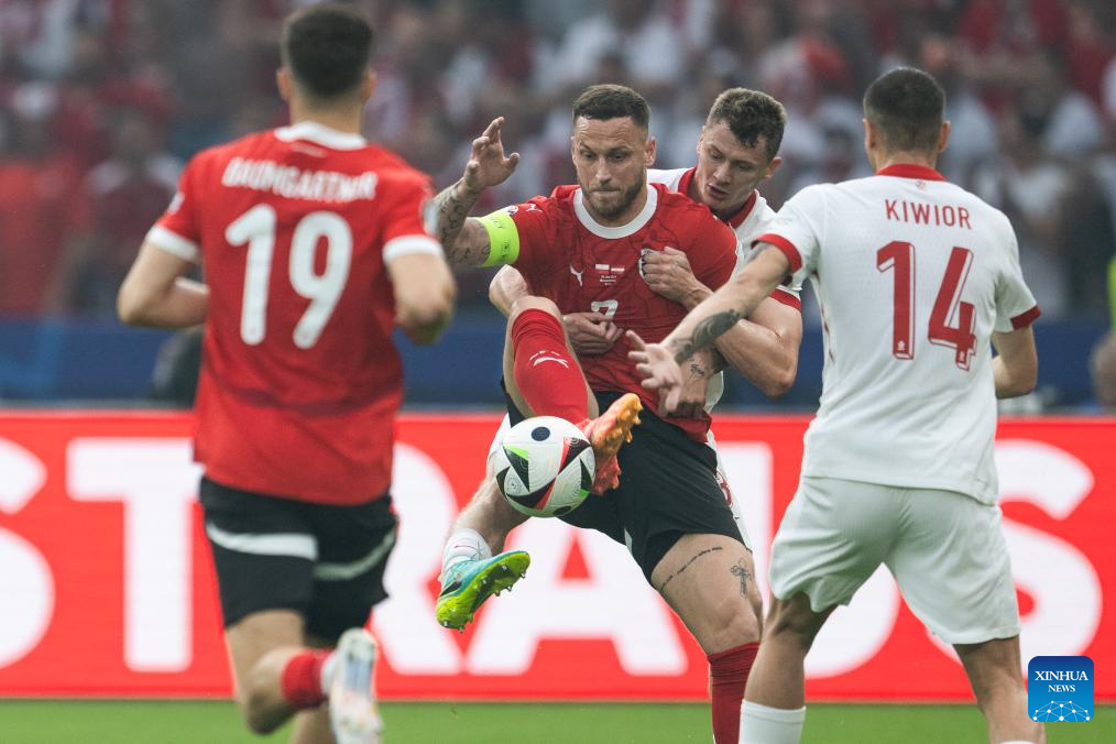 BERLIN, 22 junio, 2024 (Xinhua) -- Imagen del 21 de junio de 2024 de Marko Arnautovic (2-i), de Austria, controlando el balón durante el partido correspondiente al Grupo D de la EURO 2024 de la UEFA, entre Polonia y Austria, en Berlín, Alemania. (Xinhua/Xiao Yijiu)