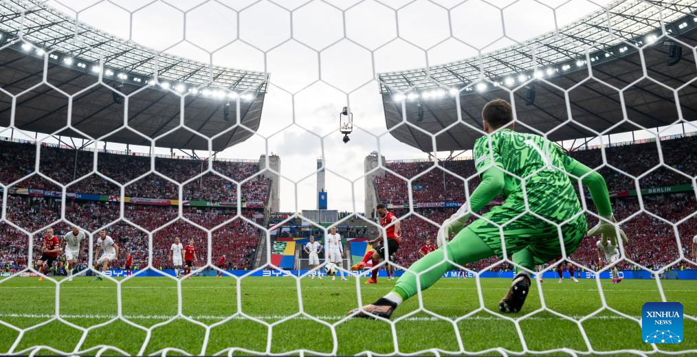 BERLÍN, 22 junio, 2024 (Xinhua) -- Imagen del 21 de junio de 2024 de Marko Arnautovic, de Austria, disparando y anotando un tiro de penal durante el partido correspondiente al Grupo D de la EURO 2024 de la UEFA, entre Polonia y Austria, en Berlín, Alemania. (Xinhua/Xiao Yijiu)