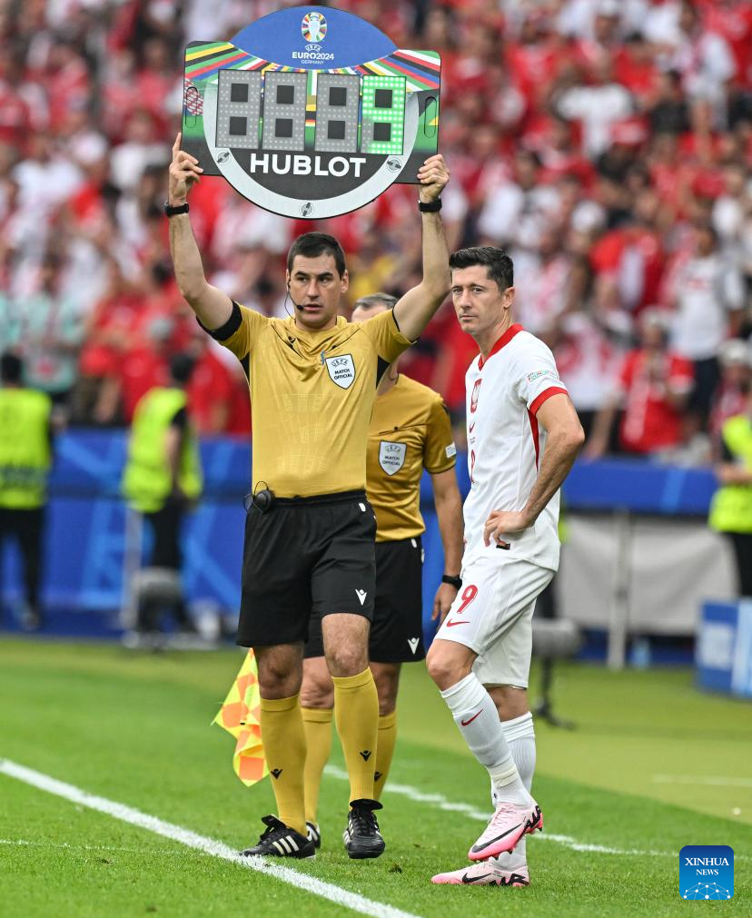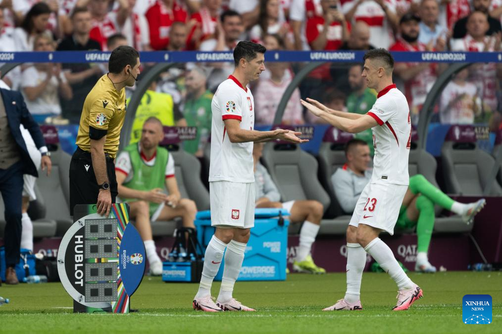 BERLIN, 22 junio, 2024 (Xinhua) -- Imagen del 21 de junio de 2024 de Robert Lewandowski (c), de Polonia, sustituyendo a su compañero Krzysztof Piatek durante el partido correspondiente al Grupo D de la EURO 2024 de la UEFA, entre Polonia y Austria, en Berlín, Alemania. (Xinhua/Xiao Yijiu)