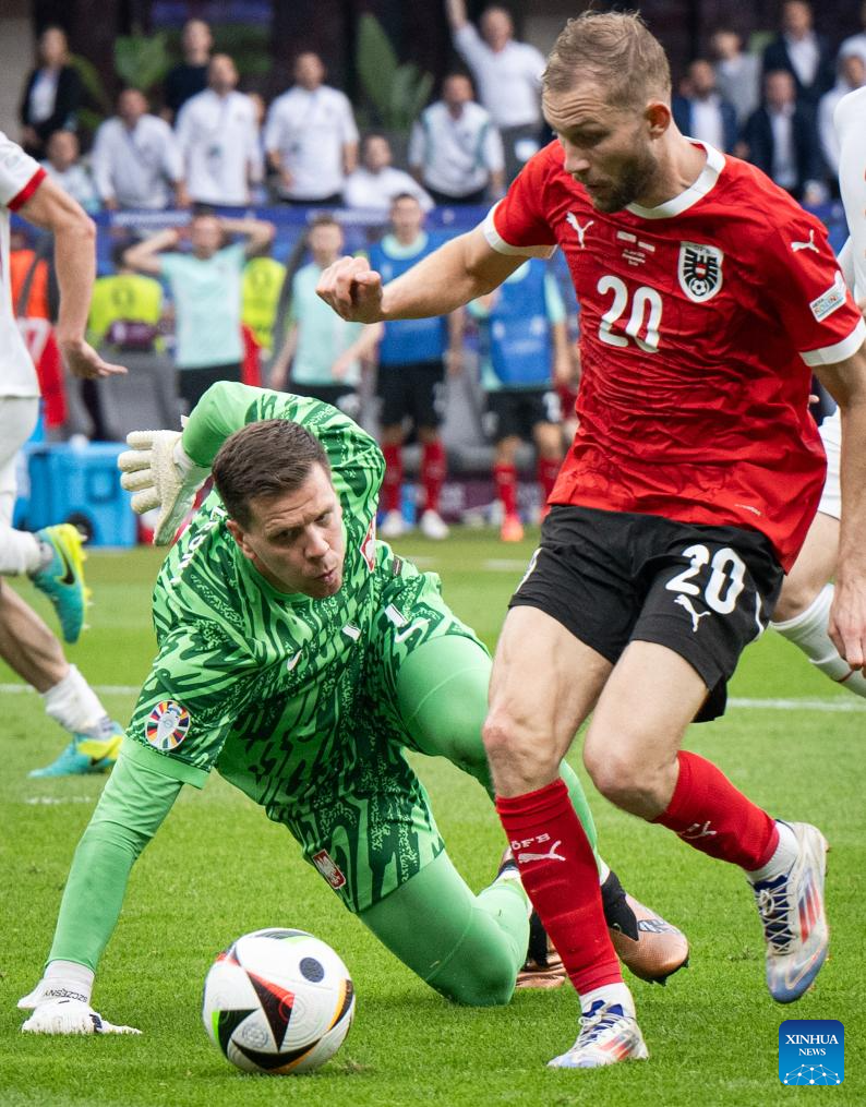 BERLÍN, 22 junio, 2024 (Xinhua) -- Imagen del 21 de junio de 2024 del guardameta Wojciech Szczesny (i), de Polonia, intentando atajar el balón durante el partido correspondiente al Grupo D de la EURO 2024 de la UEFA, entre Polonia y Austria, en Berlín, Alemania. (Xinhua/Xiao Yijiu)