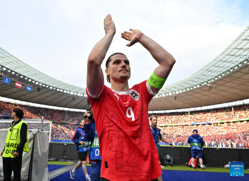 BERLIN, 22 junio, 2024 (Xinhua) -- Imagen del 21 de junio de 2024 de Marcel Sabitzer, de Austria, saludando a los espectadores al término del partido correspondiente al Grupo D de la EURO 2024 de la UEFA, entre Polonia y Austria, en Berlín, Alemania. (Xinhua/Ren Pengfei)