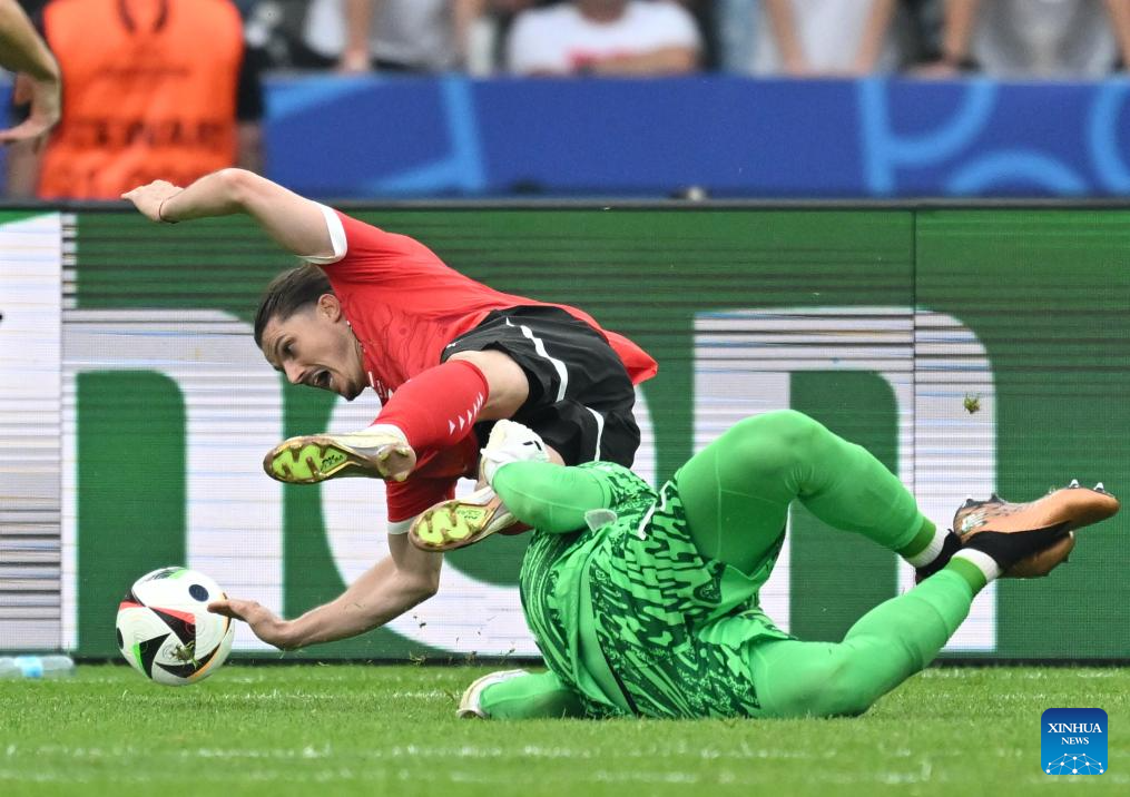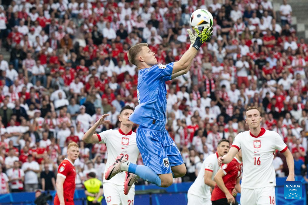 BERLÍN, 22 junio, 2024 (Xinhua) -- Imagen del 21 de junio de 2024 del guardameta Patrick Pentz (arriba), de Austria, atajando el balón durante el partido correspondiente al Grupo D de la EURO 2024 de la UEFA, entre Polonia y Austria, en Berlín, Alemania. (Xinhua/Xiao Yijiu)