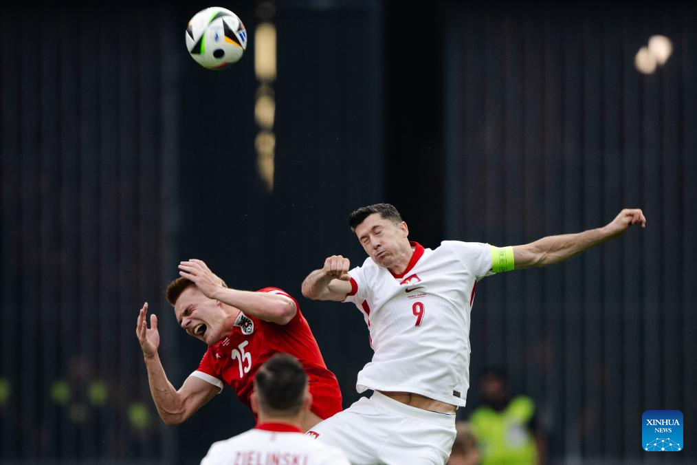 BERLIN, 22 junio, 2024 (Xinhua) -- Imagen del 21 de junio de 2024 de Robert Lewandowski (d), de Polonia, disputando el balón con Philipp Lienhart, de Austria, durante el partido correspondiente al Grupo D de la EURO 2024 de la UEFA, entre Polonia y Austria, en Berlín, Alemania. (Xinhua/Xiao Yijiu)