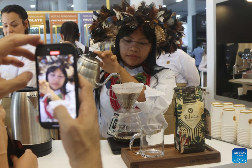 SAO PAULO, 22 junio, 2024 (Xinhua) -- Imagen del 21 de junio de 2024 de un expositor preparando café durante el Festival del Café de Sao Paulo, en Sao Paulo, Brasil. (Xinhua/Rahel Patrasso)